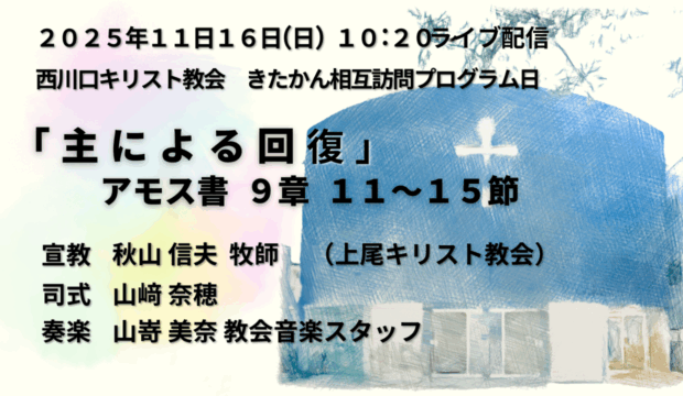 礼拝-YOUTUBE配信 2021年12月19日(日) クリスマス礼拝 ライブ配信 2021.12.19 4分45秒くらいまで早送りしていただくと礼拝が始まります。 2021年12月12日(日) 在宅主日礼拝 宣教要旨 「神の愛、キリストの愛」 ローマの信徒への手紙8章31-39節 前の記事 2021年12月19日(日) 在宅クリスマス礼拝 宣教要旨「来ませり救い主」マタイによる福音書20 章 25-28 節 次の記事